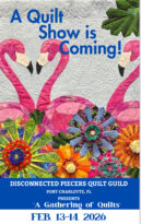 This event is sponsored by Disconnected Piecers Quilt Guild of Port Charlotte, a non-profit (501c3) organization that donates hundreds of quilts each year to Head Start, Hospice, and C.A.R.E. We do Quilts of Valor presentations a few times each year to honor local veterans. We also donate pillows and fidget mats to hospice and bedding to the SPCA. Your support of this event helps to make the continuation of those donations possible.