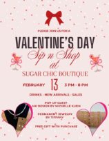 Join us for a fun and festive Valentine’s Sip & Shop at Sugar Chic Boutique on Friday, February 13 from 3 PM to 8 PM!