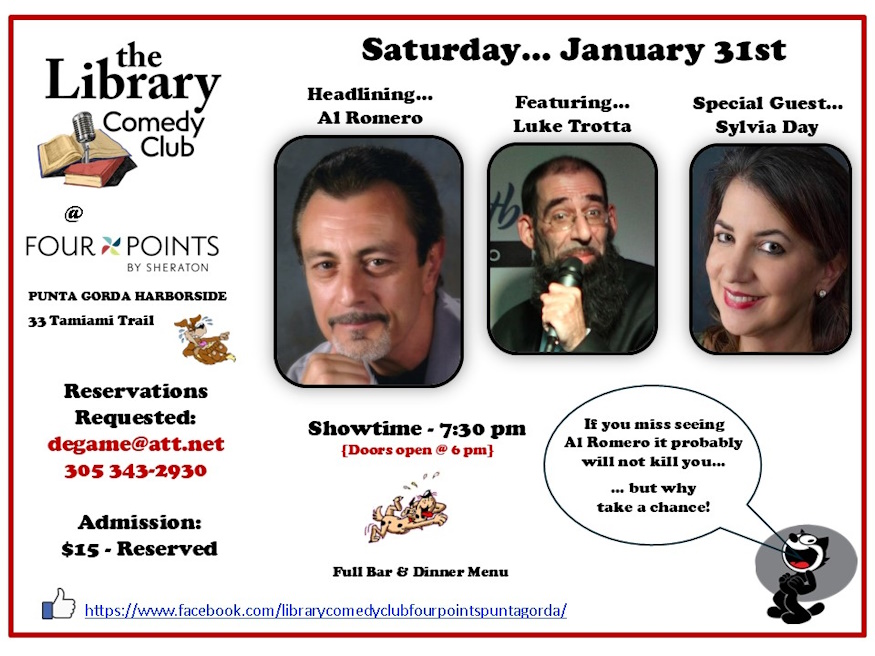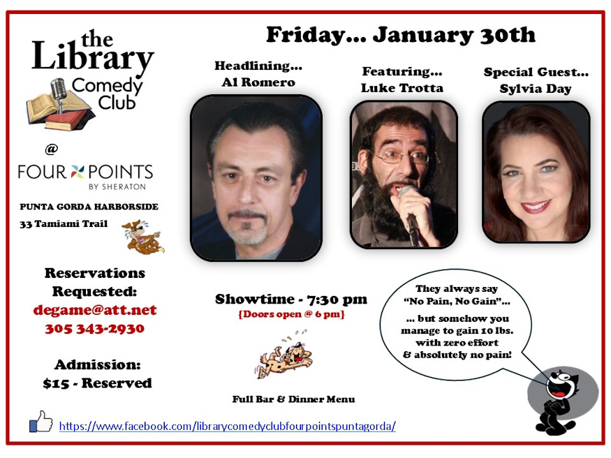Four Points by Sheraton Punta Gorda HarborsideDon’t miss the hilarious Al Romero... coming up at The Library! Al Romero is an iconic comedian, actor and author… and is seriously one of the most respected performers in the country. With an unmatched body of creative work, he has had a long & successful career in standup comedy appearing on HBO, SHOWTIME and […]