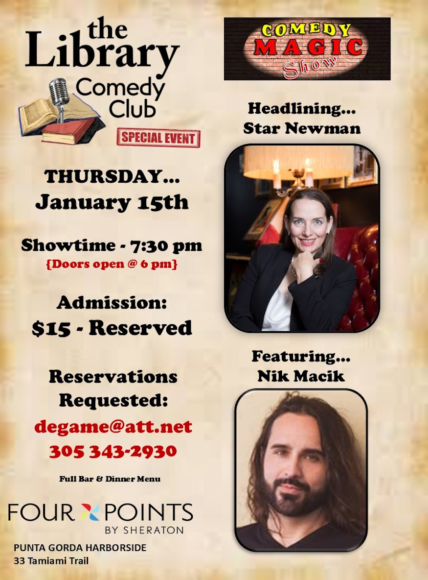 Four Points by Sheraton Punta Gorda HarborsideThe Library Comedy Club invites you to step into a magical world of wonder with Star Newman, who brings magic to life in front of your eyes! The real magic happens up close and personal when Star blends expert sleight of hand, mind-boggling mental feats, and very clever humor. She appeared in season 8 on […]