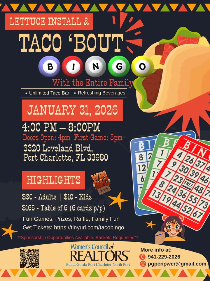 3320 Loveland Blvd, Punta Gorda, FL 33980-7403, United States 3320 Loveland Blvd, Punta Gorda, FL 33980-7403, United StatesTacos + Bingo + Installation = FUN! Join us for Taco Bingo Night as we celebrate the installation of the new Women’s Council of REALTORS® leadership board and kick off a year focused on community and growth. Get your tickets at: www.tinyurl.com/tacobingo Enjoy tacos, bingo, and great prizes, sponsored by Christopher Personal Injury Lawyer. Open […]