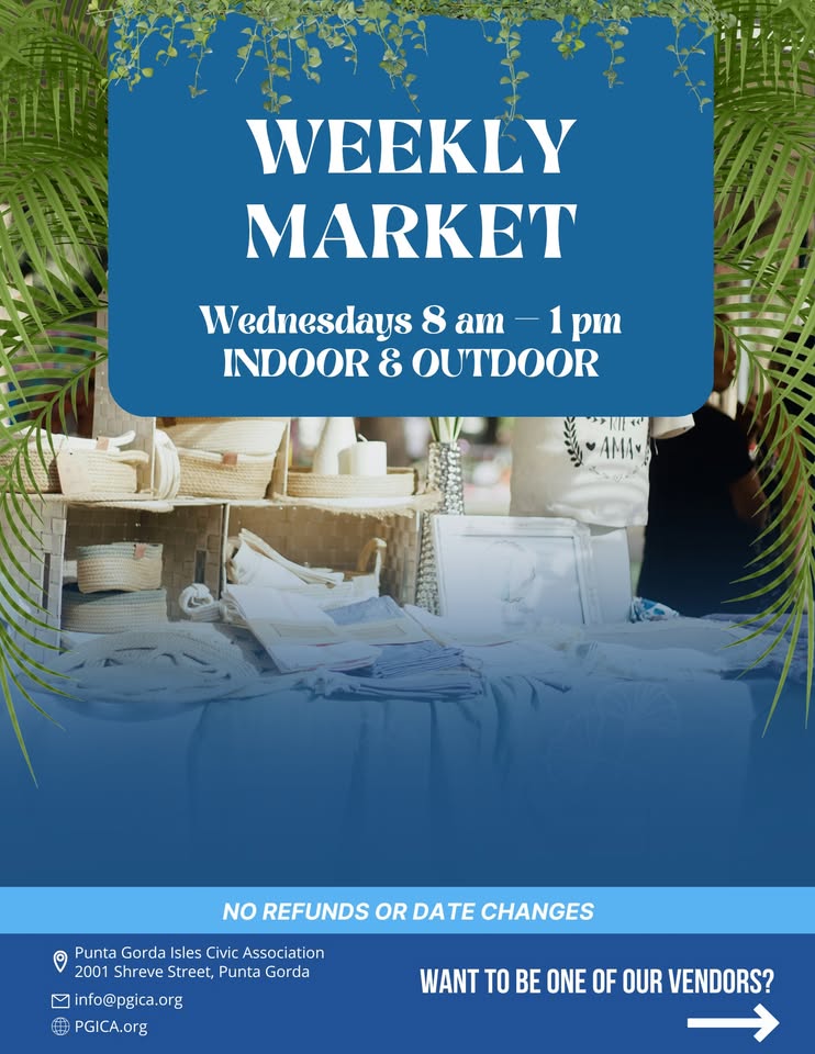 2001 Shreve St, Punta Gorda, FL, United States, Florida 33950Looking for fresh produce, unique crafts, and a fun midweek outing? PGICA’s Weekly Wednesday Market is the perfect place to shop, explore, and connect with your community!Discover local vendors, enjoy delicious treats, and support small businesses—all in one vibrant market. Bring your friends, family, and neighbors for a midweek pick-me-up!? Vendors Wanted: Interested in joining? […]