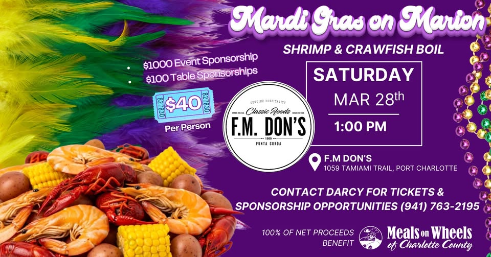 F.M. DON'S F.M. DON'S? Mardi Gras on Marion ?? Shrimp & Crawfish Boil ?? Saturday, March 28, 2026? 1:00 PM? F.M. Don’s - 201 W. Marion Avenue, Punta GordaJoin us for a fun and flavorful afternoon where 100% of net proceeds go directly to providing warm, nutritious meals to elderly adults right here in Charlotte County, bringing neighbors […]