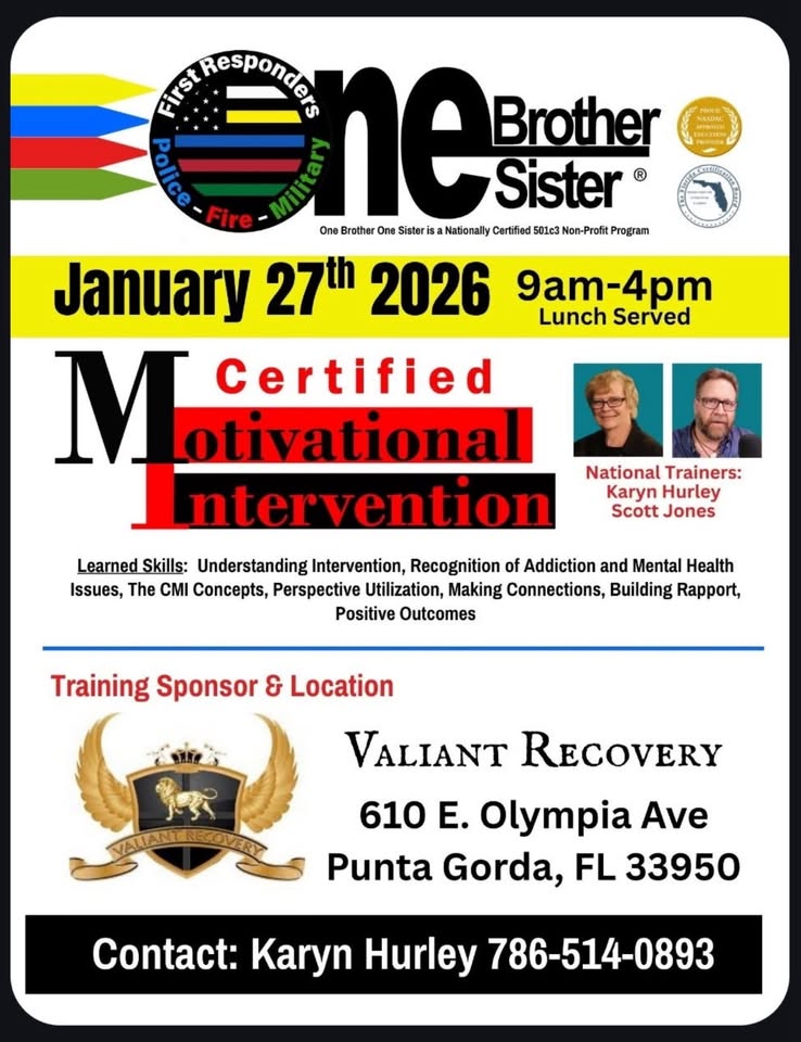 Valiant Recovery Alcohol Rehab Punta Gorda Florida Valiant Recovery Alcohol Rehab Punta Gorda FloridaThis training session will be held at our facility. For registration, please contact Karyn at One Brother One Sister. Jan 27 coming soon. This training is perfect for first responders, police, fire department, paramedics, healthcare, professional professionals working in the emergency department